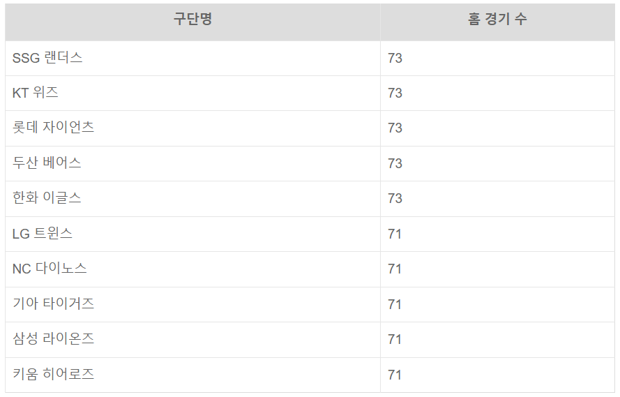 즉, 특정 구단의 홈 경기 수가 매년 달라질 수 있습니다.