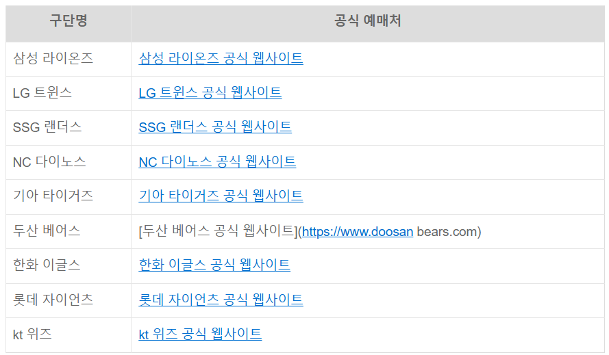 - ✔️ 각 구단별 예매처가 다름 → 반드시 구단 공식 웹사이트에서 확인 후 예매하세요.